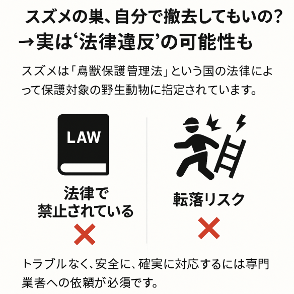 「自分で取っていいの?」→答え:NGです(法律違反になる可能性も)スズメは「鳥獣の保護及び管理並びに狩猟の適正化に関する法律(通称:鳥獣保護法)」により、捕獲・殺傷・卵の除去・巣の撤去を原則禁止されています。 許可なくスズメの巣を撤去した場合、1年以下の懲役または100万円以下の罰金が科されることもあり、 また、スズメの巣がある場所は屋根裏や換気口などの高所が多く、転落・感電など作業中の事故も少なくありません。 さらに巣を撤去しても侵入口を塞がない限り再び同じ場所に営巣することも。 ![]()